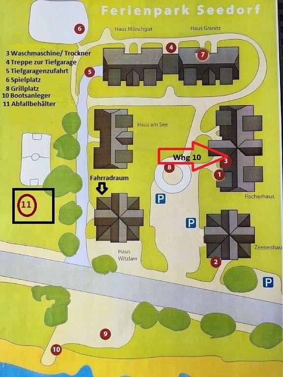 Zur Wohnung gehört ein kostenloser PKW-Stellplatz in der Tiefgarage unter dem Haus Mönchgut. Ihre Fahrräder können Sie in einem abgeschlossenen Raum, im Haus Wizlaw, abstellen.